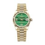 This Rolex Datejust 31 replica watch is a perfect 1:1 clone of the original. It features a 904L stainless steel case and bracelet in yellow gold. with a sapphire crystal and adjustable links. The green dial has Roman numerals and stick hands. and is powered by an automatic movement with a caliber of 2236 and a 60-hour power reserve. It is also COSC certified for precision within -3/+3 seconds per day. The watch is water-resistant up to 30m and comes with a 2-year international warranty.