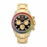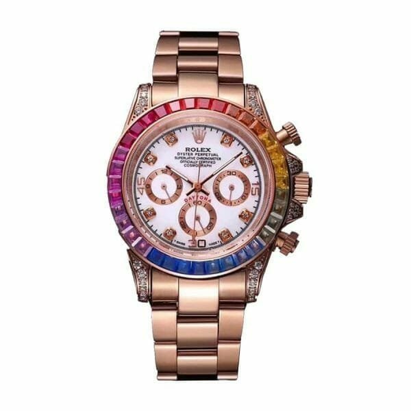 The Rolex Daytona Rainbow replica is a watch that every collector should have. It is a luxurious and eye-catching watch that will impress everyone. This super clone replica Daytona model is available in three case materials: yellow gold. white gold. and everose gold. Each variation features a rainbow dial with different stone shines. adding to its stunning appeal.